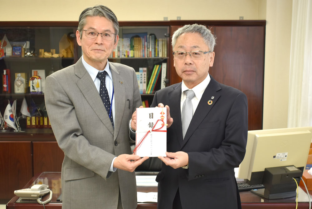 これに伴い、1月19日(月)に六ヶ所村役場にて森取締役が目録を贈呈し、奈良岡教育長より感謝状を授与されました。